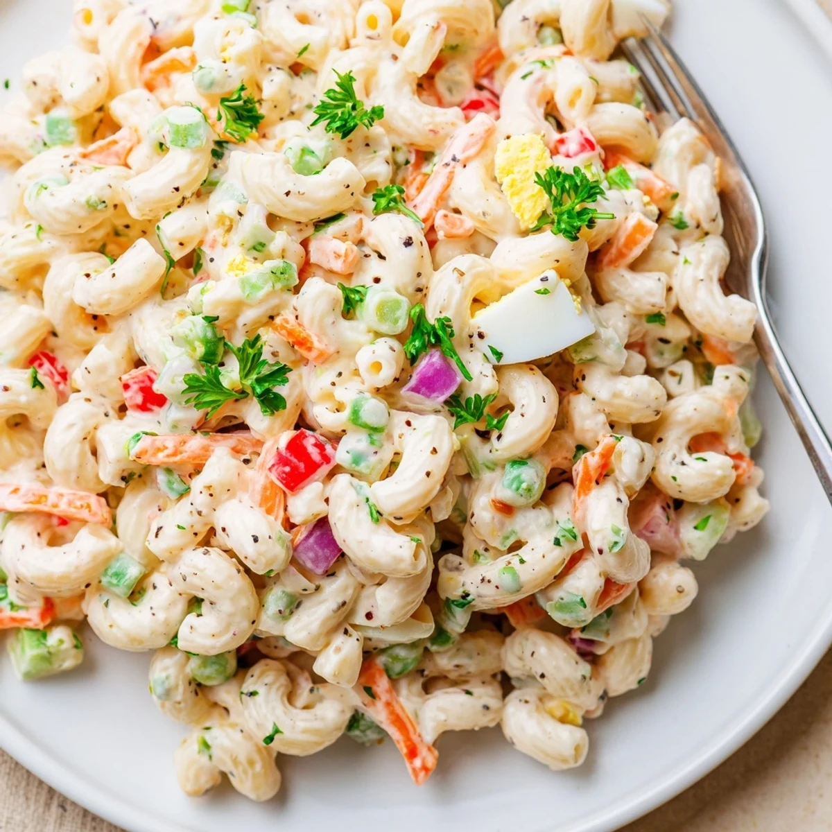 This classic creamy macaroni salad combines al dente elbow pasta with crisp celery, red bell pepper, red onion, shredded carrots and peas. A tangy dressing of mayonnaise, sour cream, Dijon mustard and apple cider vinegar is whisked until smooth and folded through. Chill at least one hour to let flavors meld; fold in parsley or chopped hard-boiled eggs if desired. For a lighter finish, swap part of the mayonnaise for Greek yogurt and adjust seasoning to taste.